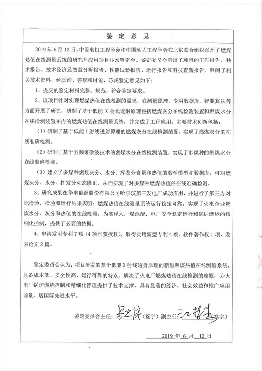 鑒定委員會認為:項目研發(fā)的基于低能X射線透射原理的新型燃煤熱值在線測量系統(tǒng),具備成本低、安全性高、運行可靠的特點,解決了火電廠燃煤熱值在線檢測的難題,為火電廠鍋爐燃燒控制和精細化管理提供了技術支撐,具有顯著的經濟、社會效益和推廣應用前景,居國際先進水平。
