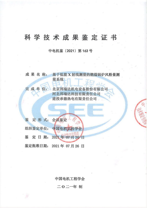 2021年7月20日,中國電機(jī)工程學(xué)會(huì)在北京組織召開了“基于低能X射線測量的燃煤鍋爐風(fēng)粉量測量系統(tǒng)”項(xiàng)目技術(shù)鑒定會(huì)。